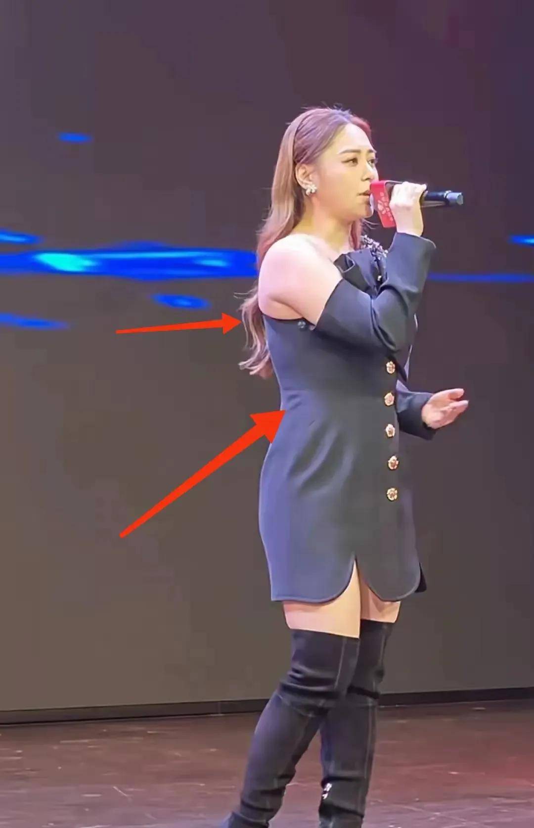 阿娇身着黑色斜肩短裙,搭配长筒高跟鞋,优雅走上永利皇宫的舞台。现场和屏幕前的观众都被她的变化惊呆。在与主持人的同框照中,阿娇的身材看起来五五分,大腿与胳膊粗细相近,赘肉清晰可见。这样的形象与她以往的形象大相径庭,让不少网友直呼“不忍直视”。有网友调侃:“阿娇怎么突然‘膨胀’了这么多?”还有网友称:“这简直是女明星和主持人同框输得最惨的一次!”